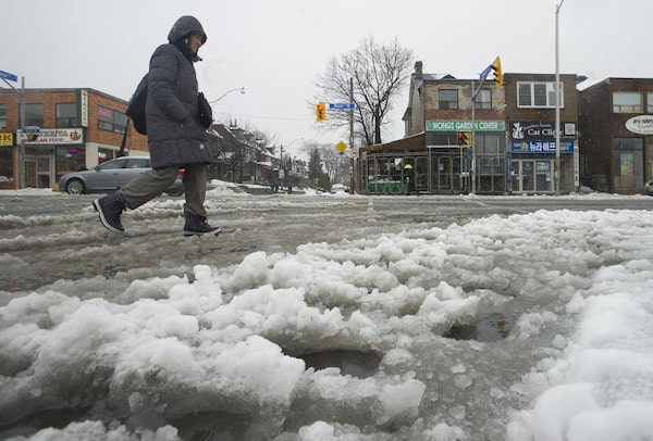 Pedestrians negotiate through slush filled streets and sidewalks during the morning commute in Toronto, Ont. Wednesday, February 27, 2013.Kevin Van Paassen/The Globe and Mail