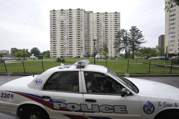 320 Dixon Road is seen in rear during a Toronto Police raid targeting drugs and guns, in Toronto June 13, 2013.J.P. MOCZULSKI/The Globe and Mail