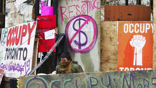 An Occupy Toronto protester bundles up in Toronto's St. James park as police moved in to evict demonstrators Nov. 23, 2011.MARK BLINCH/REUTERS