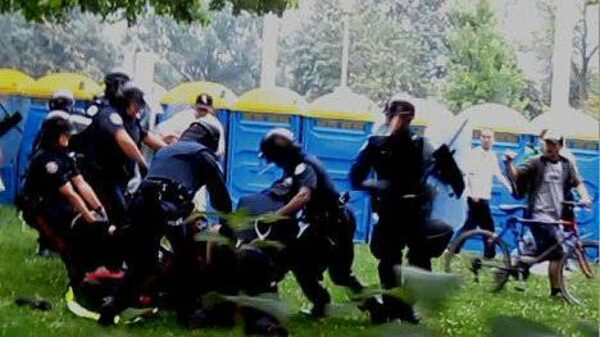 A handout photograph showing the arrest of Adam Nobody during G20 protests in Toronto.