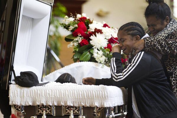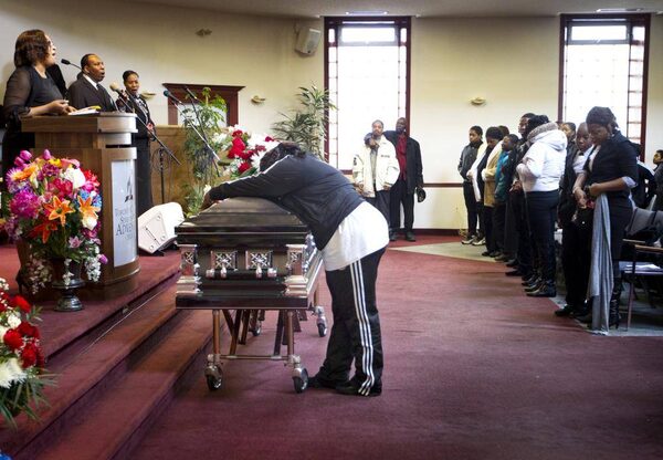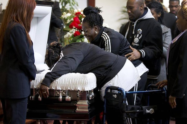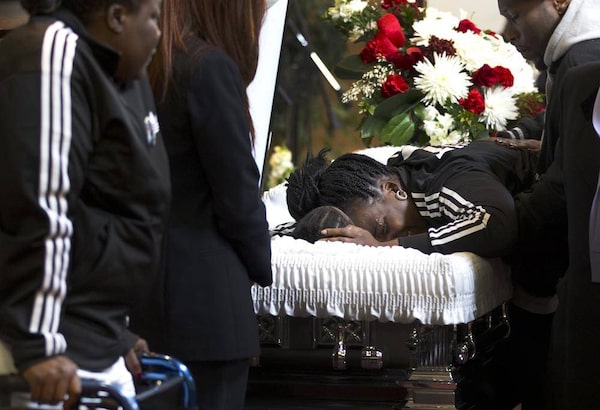 Tyson Bailey's mother drapes herself over her son's coffin during the last musical tribute at the funeral for 15-year old Tyson Bailey at the Seventh-Day Adventist Church on Bentworth Ave. in Toronto on Jan. 31, 2013. Bailey was shot to death last week in the stairwell of an apartment building in Regent Park.Peter Power/The Globe and Mail