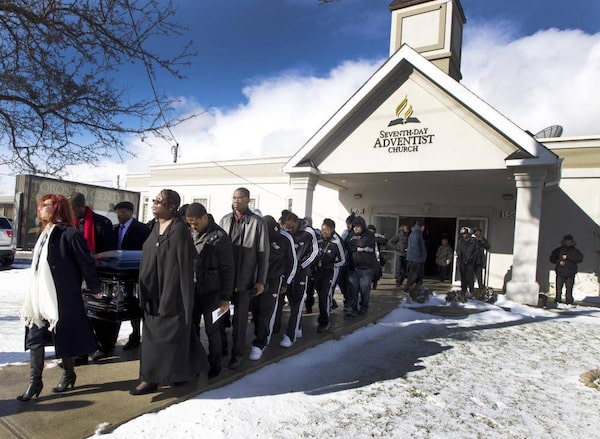 Mourners leave the church carrying the casket of 15-year old Tyson Bailey at the Seventh-Day Adventist Church on Bentworth Ave. in Toronto on Jan. 31, 2013.Peter Power/The Globe and Mail