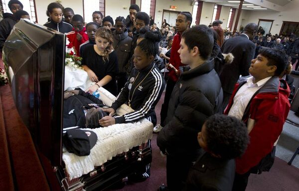 A sister of Tyson Bailey, in the track suit, spends time with her deceased brother in the company of many of his friends and family during the funeral for the 15-year old at the Seventh-Day Adventist Church on Bentworth Ave. in Toronto on Jan. 31, 2013.Peter Power/The Globe and Mail