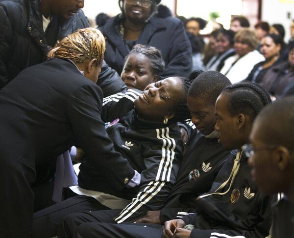 A sister of Tyson Bailey is helped to her seat after saying her final farewell to her brother at the funeral for the 15-year old at the Seventh-Day Adventist Church on Bentworth Ave. in Toronto on Jan. 31, 2013.Peter Power/The Globe and Mail