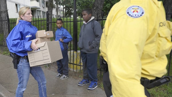 Children en route to school watch as police carry out boxes of evidence outside 320 Dixon Road during a Toronto police raid targeting drugs and guns, in Toronto June 13, 2013.J.P. Moczulski/The Globe and Mail