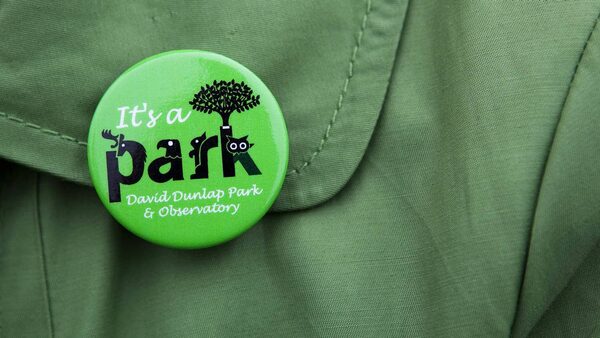A button worn by Karen Cilevitz, chair of the David Dunlap Observatory Defenders, in 2011.