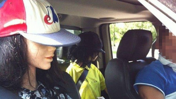 Two mannequins sitting in the car of a man ticketed for an HOV lane violation are shown in a handout photo from the Toronto Police Service, Wednesday, July 8, 2015. Police say a Toronto driver has been charged after getting caught travelling in a marked HOV lane with the mannequins.