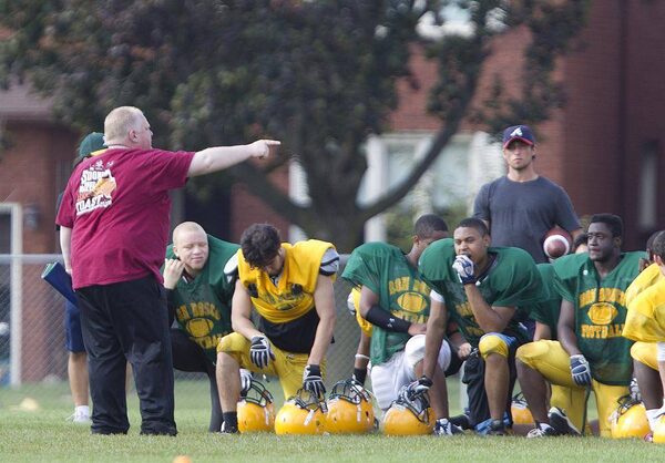 Toronto Mayor Rob Ford coaches the Don Bosco Eagles on Sept. 11, 2012, with his city hall assistant Andrew Gillis, at right in blue shirt.Peter Power/The Globe and Mail