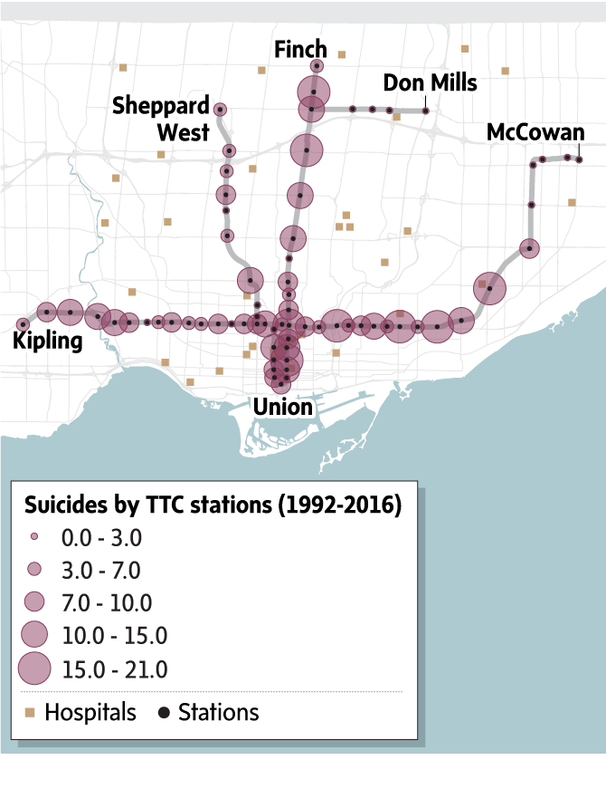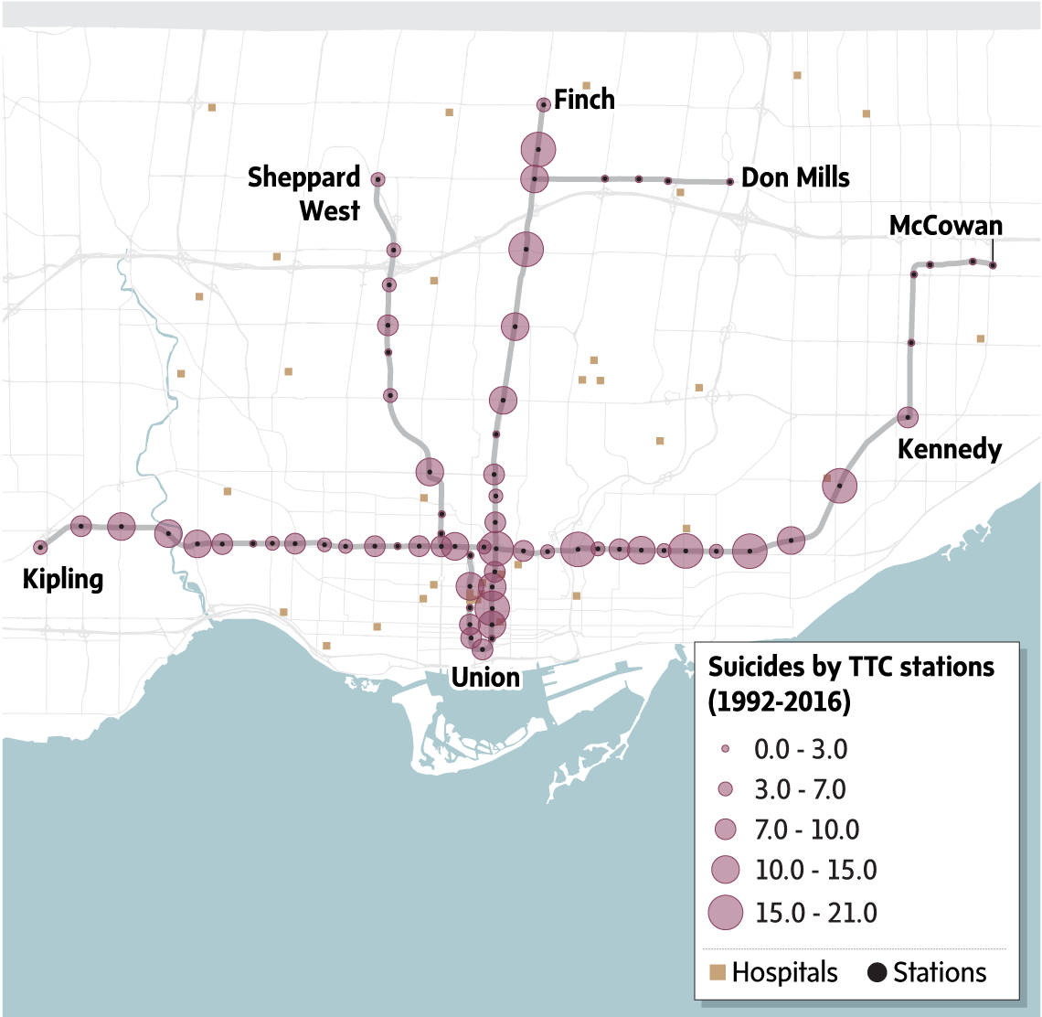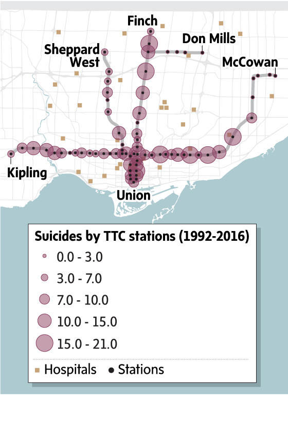 The subway station where Abby chose to end her life is one of the worst in the city for suicidal acts. The TTC has always said there are no suicide hot-spots, but acknowledge having done limited analysis of their data. The Globe and Mail study of decades of agency data, obtained for the first time after a lengthy freedom of information process, found long-term patterns showing that these incidents are distributed very unevenly throughout the system. Some stations are far worse than others.