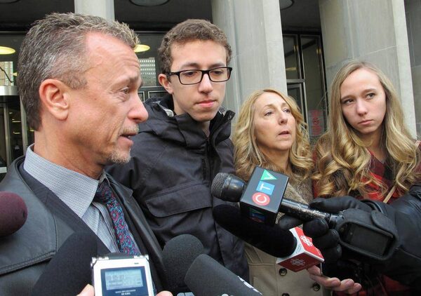 Connor Stevenson, 15, shot in the head at the Eaton Centre food court in June 2012, listens as his father Craig Stevenson speaks to the media following a sentencing hearing for the gunman, Christopher Husbands, in Toronto on Friday, Jan. 9, 2015.Colin Perkel/The Canadian Press