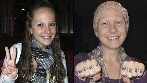 Ashley Kirilow image (left), and feigning the effects of chemotherapy (right).