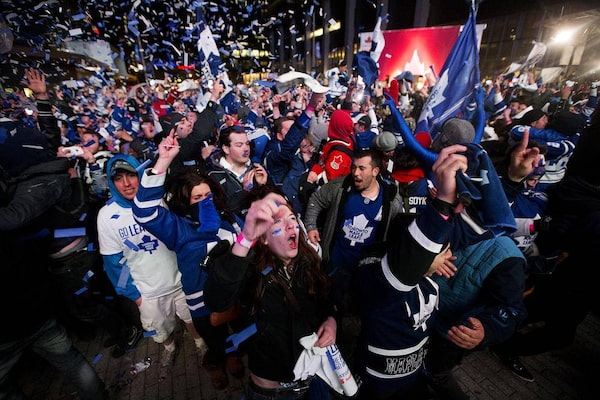 Laura-lee Jack celebrates with a crowds of fans as the Toronto Maple Leafs take a 2-1 win over the Boston Bruins during Game 6 of the Eastern Conference quarter-final at Toronto's Maple Leaf Square on Sunday, May 12, 2013.Michelle Siu/The Globe and Mail