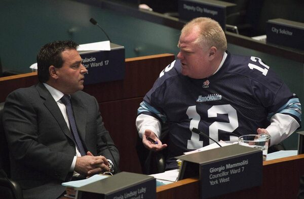 Toronto Councillor Giorgio Mammoliti, left, talks with then-mayor Rob Ford on Nov. 14, 2013. Mr. Mammoliti has had a seat beside the mayor’s for 15 years, and says he won’t relinquish it for the current deputy mayor, Denzil Minnan-Wong, without concessions from Mayor John Tory.NATHAN DENETTE/The Canadian Press