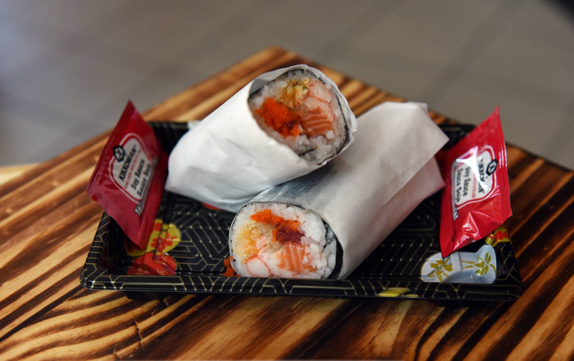 Sushirito (Edo Sushi, price not available at time of publication) The sushirito looks like your traditional Japanese futomaki, a thick sushi rolls with the fillings – salmon, tuna, lettuce, cucumber, crab meat and roe – on the outside and conveniently wrapped with seaweed for you to hold with your hands as you cheer on your favourite teams.
