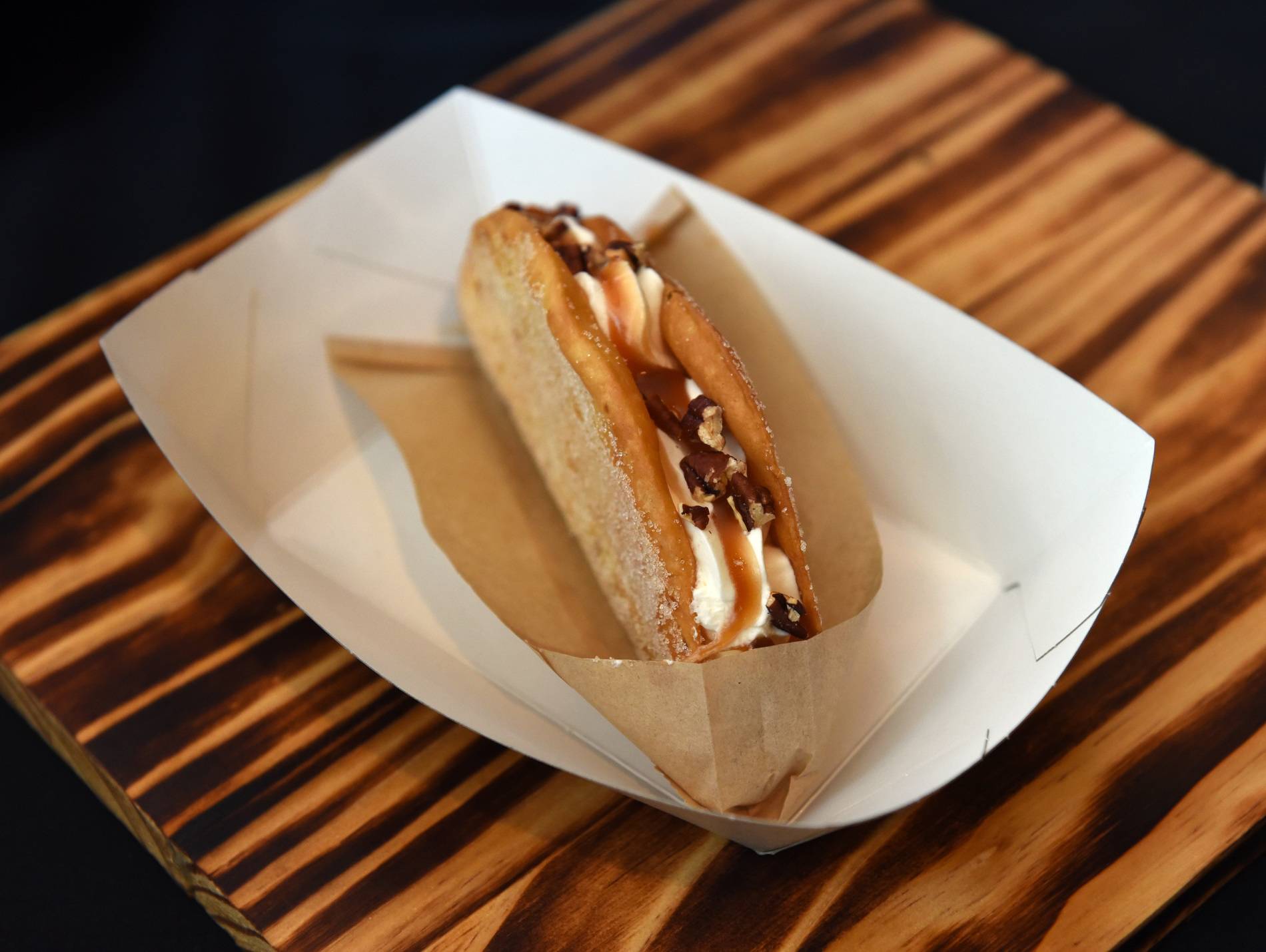 Sweet Wally’s dessert taco (Sweet Wally’s, $5) A crunchy hard shell envelops an apple pie filling, whipped cream with pralines and salted caramel sauce on top. It’s sweet and not too heavy, despite the numerous ingredients in its presentation.