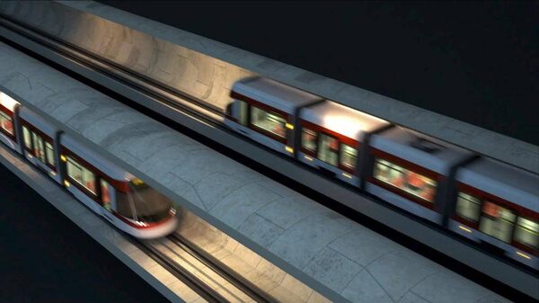 This Metrolinx-TTC rendering shows LRT cars passing on Eglinton LRT line.