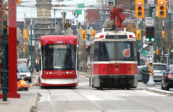 One of Toronto’s new streetcars, left, passes an old one on Spadina Avenue. The city is now expected to have only 16 new vehicles by the end of the year, less than one-quarter of the number originally promised.Emma Ewing-Nagy/The Globe and Mail