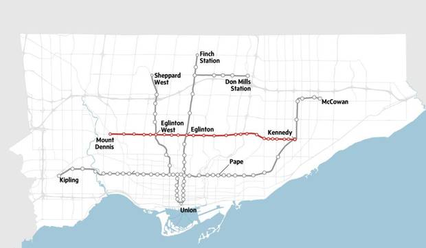 Being built across Toronto's midtown, the 19-kilometre light rail line will run from Kennedy station in the east, to Jane Street in the west. The central 10-kilometre portion will run underground – tunnels are currently being dug – with the rest on the surface. Work on the first station was formally begun last week and the whole project, with a price tag of $5.3-billion, is scheduled to be completed in 2021.