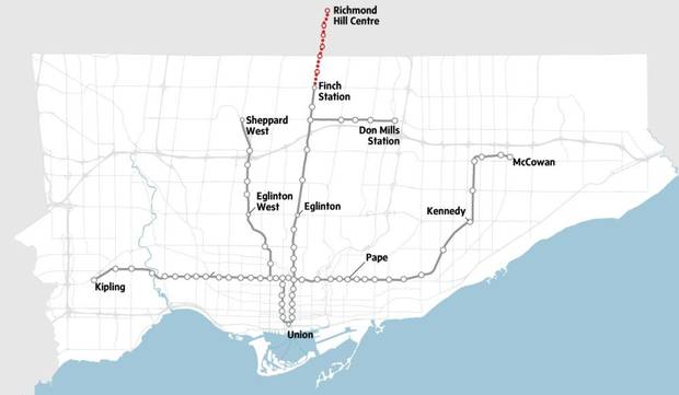 Politicians north of Toronto are keen to extend the TTC's Yonge line about six more kilometres, to Richmond Hill, calling it a "missing link" in the area's transit network. The idea was listed among the "next wave" of Metrolinx projects and some initial work has been done, but the estimated cost of $4-billion has not been funded. Transit planners and politicians in Toronto are firm that more riders cannot be added to the already crowded Yonge line without offering relief elsewhere in the system. A map from the city's planning department shows this route only as unspecified rapid transit. Metrolinx is currently doing planning and design work.