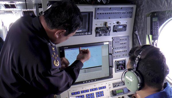 In this photo released by Malaysian Maritime Enforcement Agency, Director General of the Malaysian Maritime Enforcement Agency Admiral Mohd Amdan Kurish, left, checks a radar during a searching for the missing Malaysia Airlines plane off Tok Bali Beach in Kelantan, Malaysia.