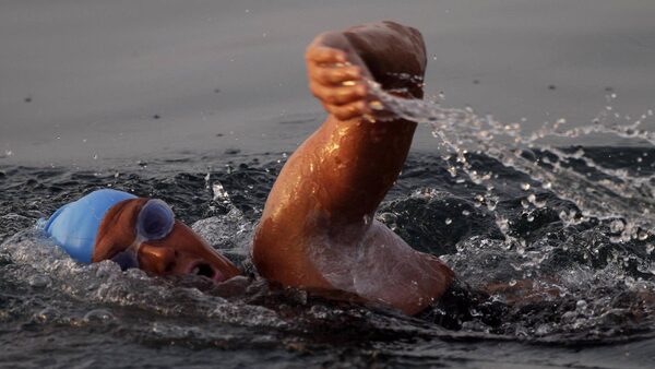 More than 12 hours earlier and cheered on by well-wishers, the veteran long distance swimmer had plunged into the sea at the Marina Hemingway on the western outskirts of the Cuban capital Havana as the sun set in a fiery glow.