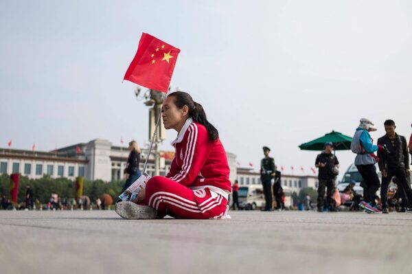 A tourist holding a national flag sits on the ground at Tiananmen Square in Beijing on October 16, 2017.FRED DUFOUR/AFP / Getty Images