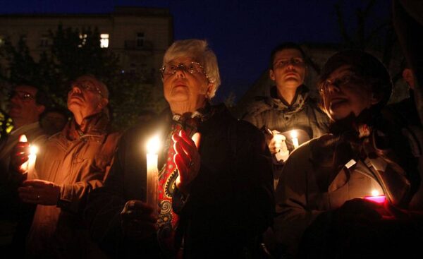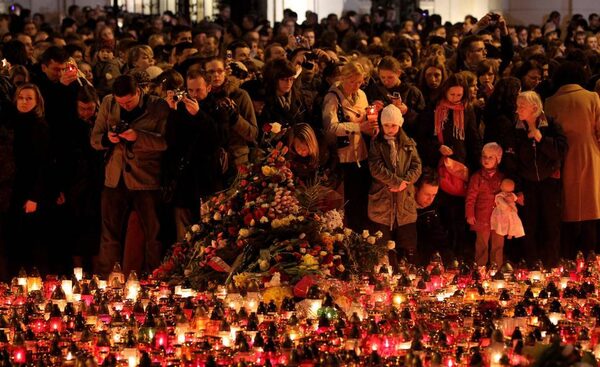 The tragedy was felt around the world, and vigils were held throughout the region and beyond. In Hungary's capital, Budapest, a man holds a Polish flag during a sombre, candlelight ceremony for the victims.Karoly Arvai/Reuters