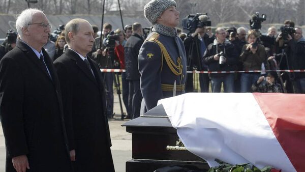 Russian Prime Minister Vladimir Putin (R) and Polish ambassador to Russia Jerzy Bahr stand next to the coffine of Polish President Lech Kaczynski during farewell ceremony at the airport of Smolensk on April 11, 2010. Russian Prime Minister Vladimir Putin flew back Sunday to the site of Polish president Lech Kaczynski's jet crash for a service to commemorate the victims.The body of Polish President Lech Kaczynski was on Sunday put on a plane to be sent to Warsaw, in the presence of Russian Prime Minister Vladimir Putin, an AFP correspondent reported.ALEXEY NIKOLSKY/AFP / Getty Images