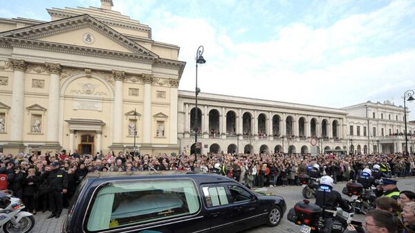 A hearse carrying the coffin of Polish President Lech Kaczynski drives through downtown Warsaw April 11, 2010. Kaczynski's coffin returned home to a stunned nation on Sunday, a day after he and much of the country's political and military elite perished in a plane crash in Russia.STR