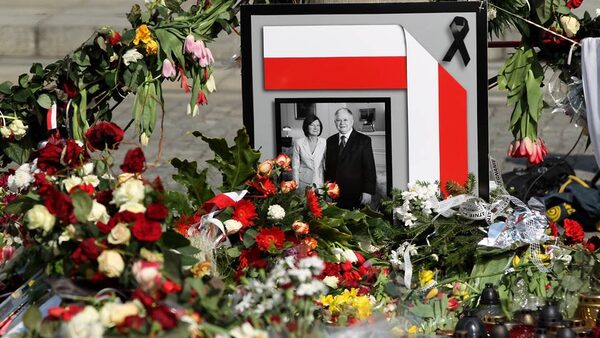 A portrait of late Polish President Lech Kaczynski and his wife Maria stands among candles and flowers left by mourners outside the Presidential Palace on April 11, 2010 in Warsaw, Poland. Kaczynski, his wife Maria and leading members of the Polish military and government were killed when the presidential plane they were travelling in crashed while attempting to land at Smolensk, Russia, the day before. The delegation was on its way to attend memorial services for the thousands of Polish military officers murdered by the Soviets during World War II at Katyn.Sean Gallup