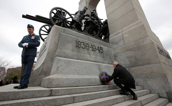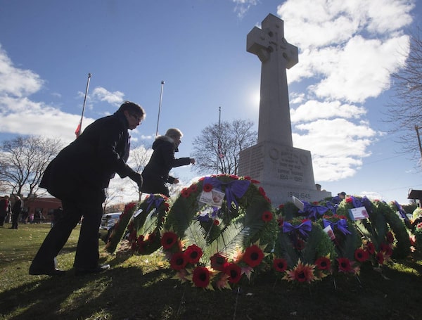Members of the public place their poppies on the cenotaph at Grand Parade Square in Halifax.Darren Calabrese/The Canadian Press