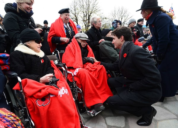 Prime Minister Justin Trudeau talks to veterans during a Remembrance Day ceremony at the National War Memorial in Ottawa.Sean Kilpatrick/The Canadian Press