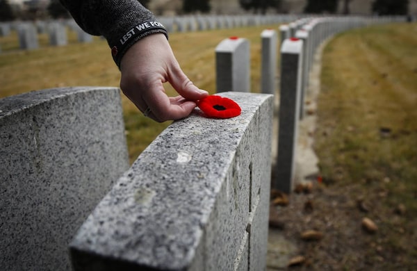 Jamie McIntosh places a poppy on a grave marker at a military cemetery following a Remembrance Day service in Calgary.Jeff McIntosh/The Canadian Press