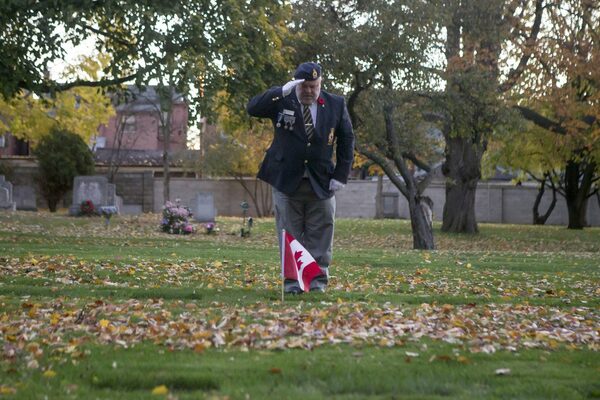 Walter Stevens offers a salute at the grave of his great grandfather Andrew Belcher who served in the Boer War and World War One, ahead of a Remembrance Day Ceremony at Prospect Cemetary in Toronto.Chris Young/The Canadian Press