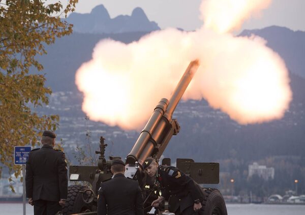 A cannon is fired off during the 21 gun salute during Remembrance Day celebrations in Vancouver, B.C.Jonathan Hayward/The Canadian Press