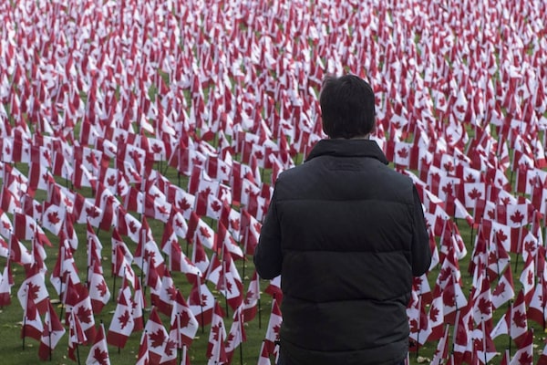 A man takes a cell phone photo of a display of small Canadian flags in honour of Remembrance Day, in front of Manufacturers Life Insurance building in Toronto.Chris Young/The Canadian Press