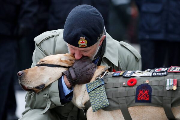A veteran embraces his service dog during Remembrance Day ceremonies at the National War Memorial in Ottawa.Chris Wattie/Reuters