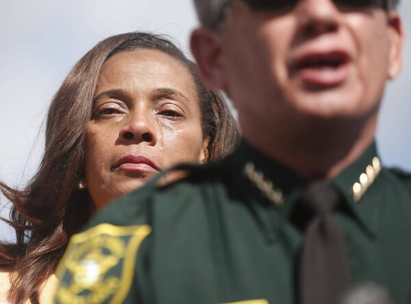 Tears run down the face of Broward County School Board member Rosalind Osgood as she listens to Broward County Sheriff Scott Israel speak during a news conference on Feb. 15, 2018 in Parkland, Fla.Wilfredo Lee