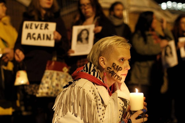 Hanna Graham joins a protest candle lit vigil outside Belfast City Hall, Northern Ireland, Thursday, Nov. 15, 2012 for Savita Halappanavar, the 31-year old Indian woman who was 17-weeks pregnant when she died of blood poisoning after suffering a miscarriage in Galway, Ireland, on 28 October. Savita Halappanavar's father, Andanappa Yalagi, said the combination of medical negligence and Irish abortion laws led to his daughter's death.Peter Morrison/The Associated Press