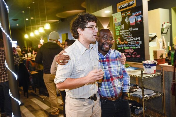 Wilmot Collins, right, rejoices after election results declare him the next mayor of Helena, Mont., on Nov. 7, 2017. Mr. Collins ran on a ‘progressive’ ticket, pledging to tackle issues such as homelessness and the cost of housing.Thom Bridge