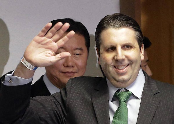 U.S. Ambassador to South Korea Mark Lippert waves as he arrives to hold a press conference before being discharged from Severance Hospital in Seoul, South Korea, Tuesday, March 10, 2015.Ahn Young-joon/The Associated Press
