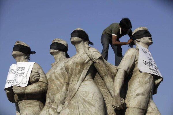 A student activist puts black scarves on the eyes of Shoparjito Shadhinota, a sculpture that represented all sections of people in Bangladesh's liberation War in 1971, demanding capital punishment for Bangladesh's Jamaat-e-Islami senior leader Abdul Quader Mollah, after a war crimes tribunal sentenced him to life imprisonment, in the campus of University of Dhaka February 6, 2013. The war crimes tribunal sentenced Quader Mollah, 64, to life in prison on Tuesday, the second verdict in trials that have reopened wounds about the country's independence war and sparked riots. He was found guilty of charges including murder, rape, torture and arson during Bangladesh's war to break away from Pakistan in 1971.ANDREW BIRAJ/Reuters
