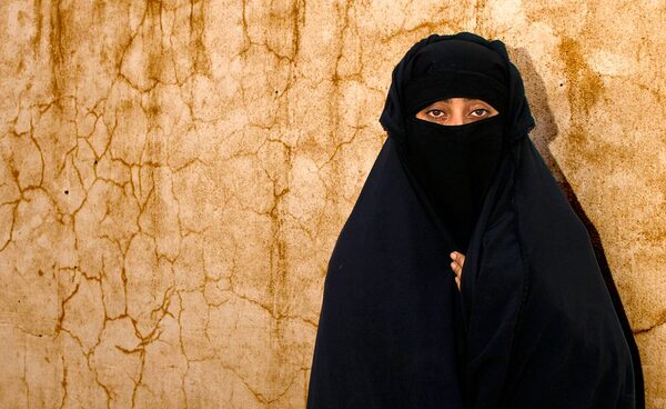 A woman in Kandahar wears a black chaderi covering, revealing only her eyes.Paula Lerner