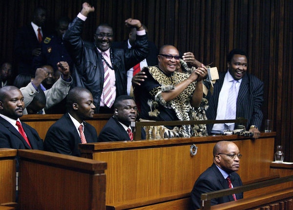 South Africa's former deputy president Jacob Zuma (bottom, R) sits, on May 8 2006, in the dock during his trial in the Johannesburg High Court in Johannesburg, South Africa. Zuma was acquitted of rape, salvaging his career with a verdict that capped the country's most sensational trial since the end of apartheid.JON HRUSA/AFP / Getty Images