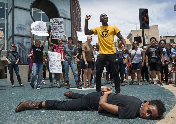 Ola Aromaye, center, chants as he and Jamie Davis, bottom, protest the shooting this week in Baton Rouge, La., of Alton Sterling, Thursday, July 7, 2016 in front of City Hall in Columbia, Mo.Daniel Brenner/The Associated Press