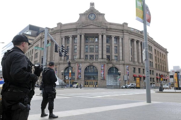 SWAT officers from suburban communities aid Boston police in keeping guard at the nearly deserted South Station area of the city during the manhunt.NEAL HAMBERG/Reuters