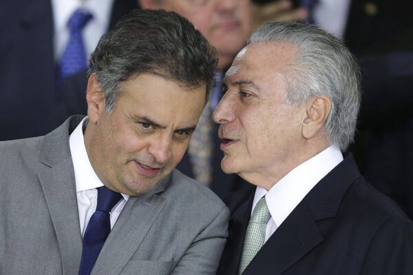 In this May 12, 2016 file photo, Brazil's acting President Michel Temer whispers into the ear of Sen. Aecio Neves, at Planalto presidential palace in Brasilia, Brazil. On Thursday, May 18, 2017, Brazilian federal police searched the office and homes of Neves, a top senator and presidential contender.Eraldo Peres/The Associated Press