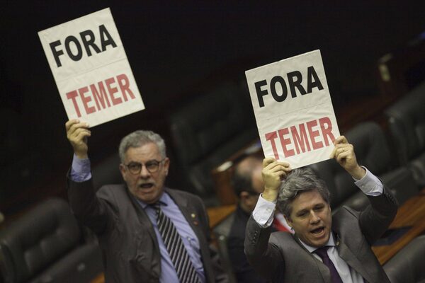 Deputies from opposition parties carry signs that read ‘Temer Out’ during a key vote in the lower chamber of Brazil's Congress in Brasilia on Aug. 2, 2017.Eraldo Peres/The Associated Press