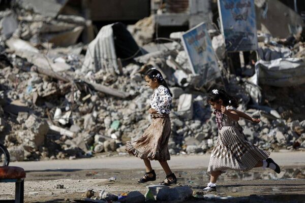 Palestinian girls walk on a street near the rubble of houses that were destroyed during the seven-week Israeli offensive, on October 4, 2014 in the northern district of Beit Hanun in the Gaza Strip on the first day of the Muslim Eid al-Adha.MOHAMMED ABED/AFP / Getty Images
