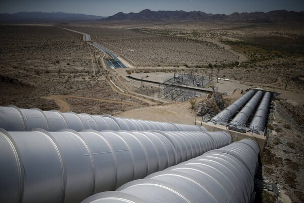 Water from Lake Havasu is pumped to a hilltop in Hayfield Lake, California and gravity fed though the Colorado River Aqueduct to supply southern California.Lucy Nicholson/Reuters
